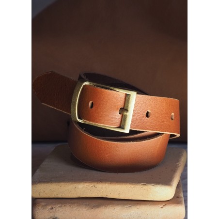 Acabado en cuero vacuno de origen Español de alta calidad efecto envejecido. Hebilla en acabado envejecido de 3.5 cm ancho.